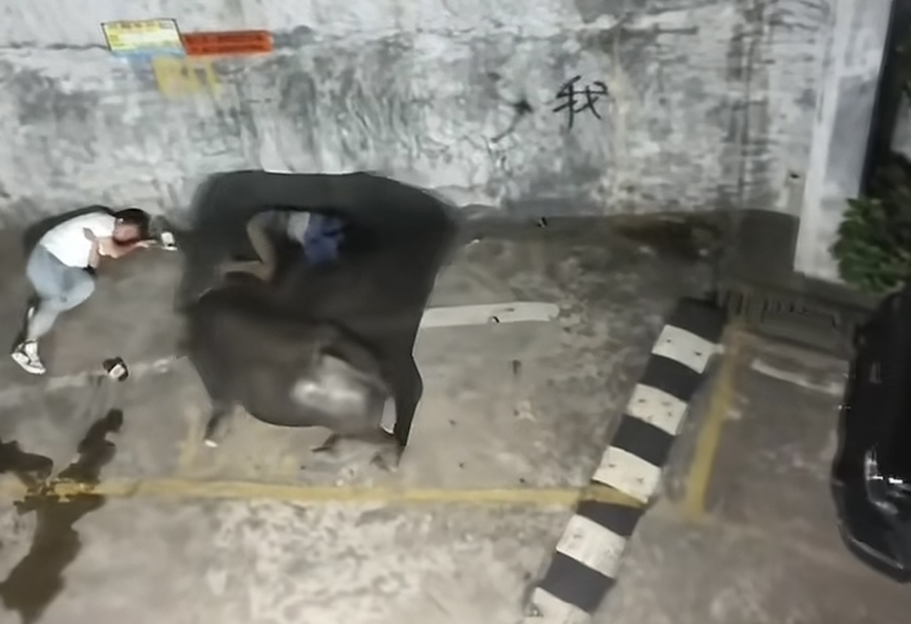 10月11日晚,有多名网友发布视频显示,在广西梧州藤县县城街道上,突然冒出一头牛,冲向人群,有两人倒在地上,后在水牛离开后被周围人扶起。